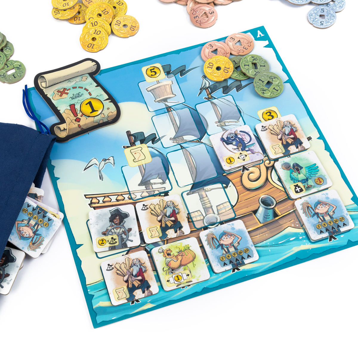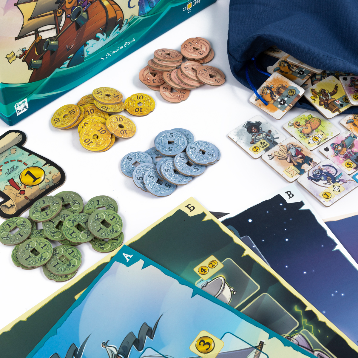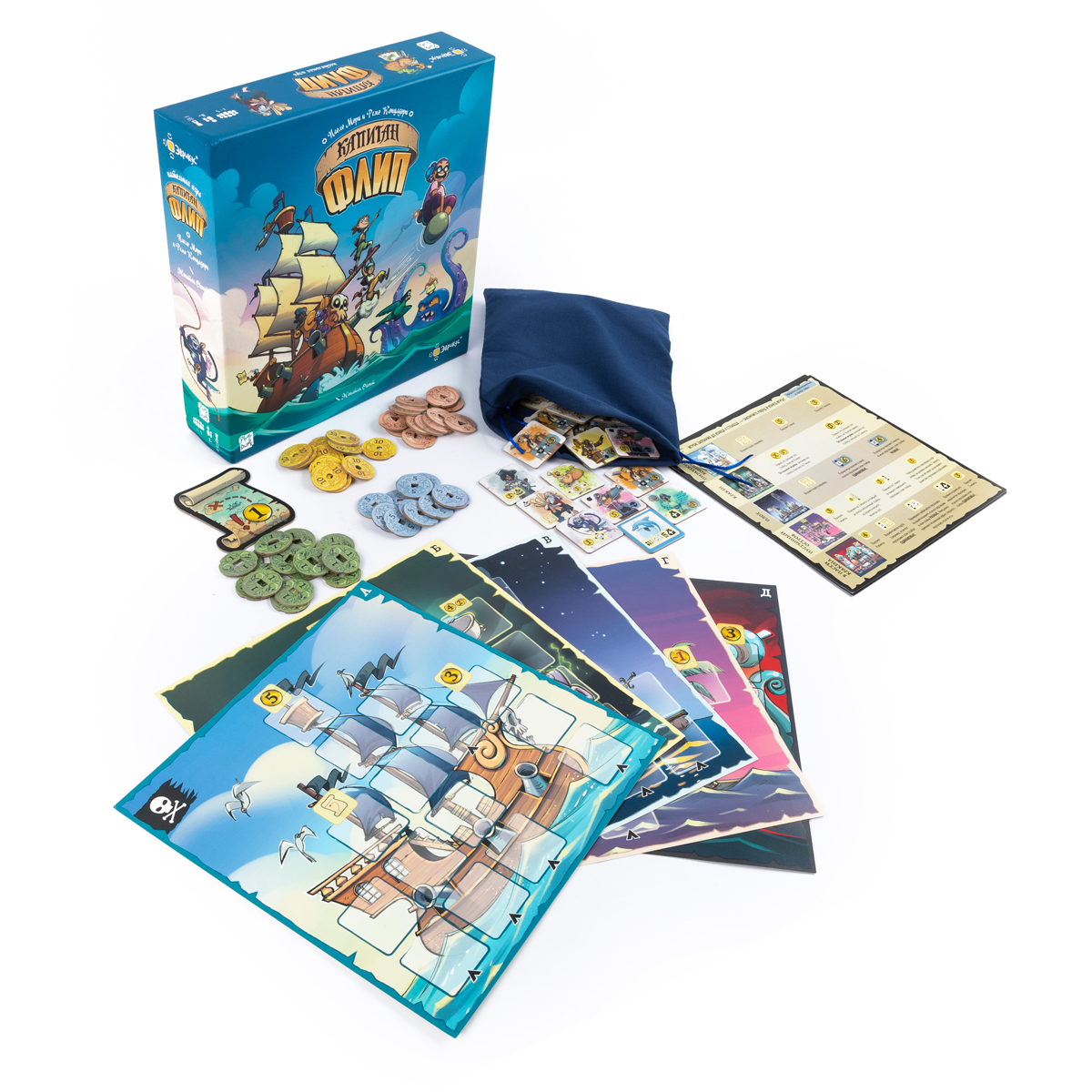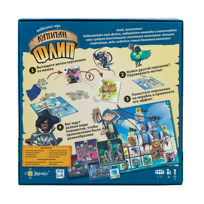 «Капитан Флип» — это захватывающая быстрая игра на размещение жетонов, где вы становитесь капитаном пиратского корабля, а ваша задача - собрать лучшую команду и заработать как можно больше золотых монет. В мешке с двусторонними жетонами 9 уникальных персонажей со своими свойствами, которые могут как помочь вам, так и иногда навредить. Однако, у вас есть возможность перевернуть жетон персонажа, если вам не подходит вытащенный член команды, но только 1 раз!