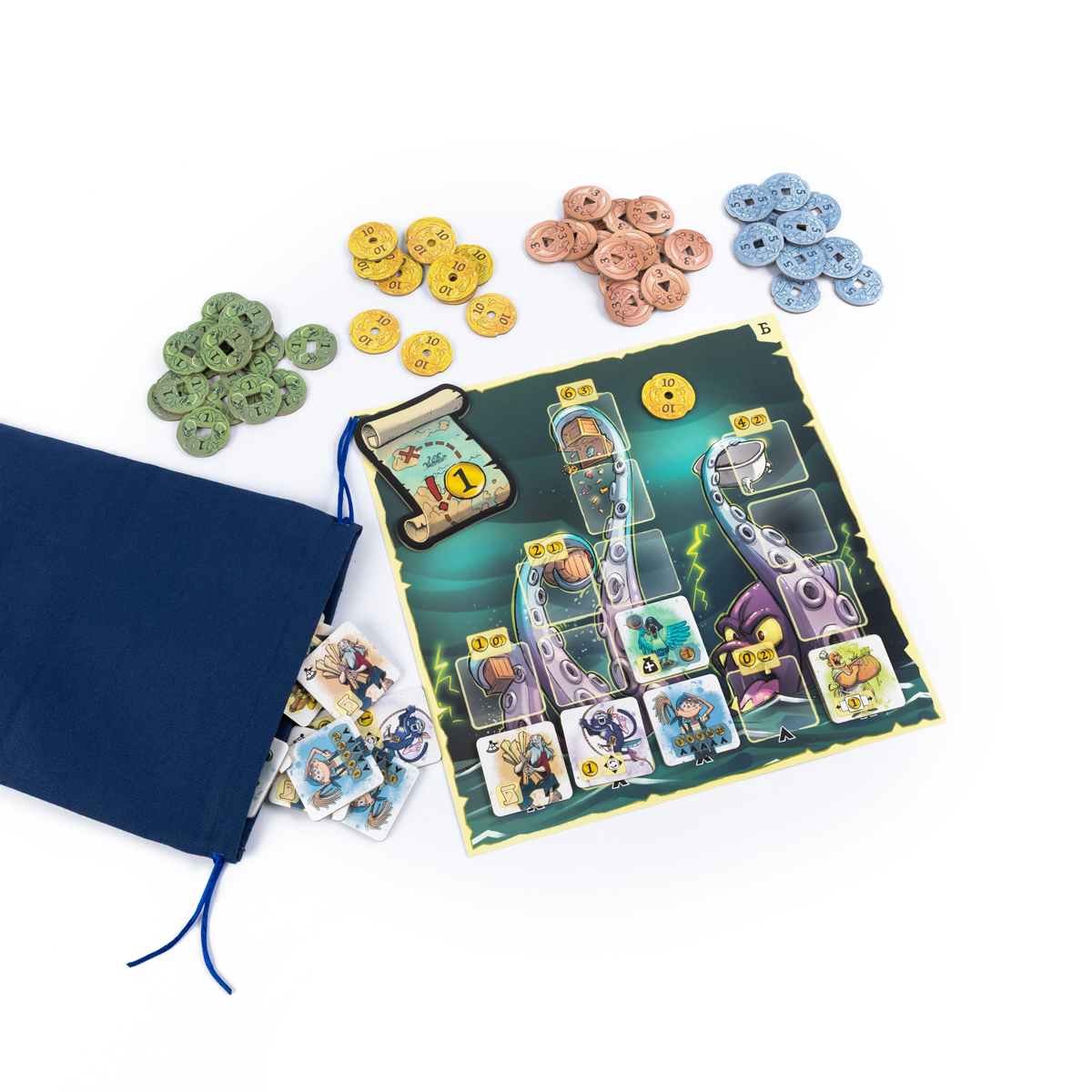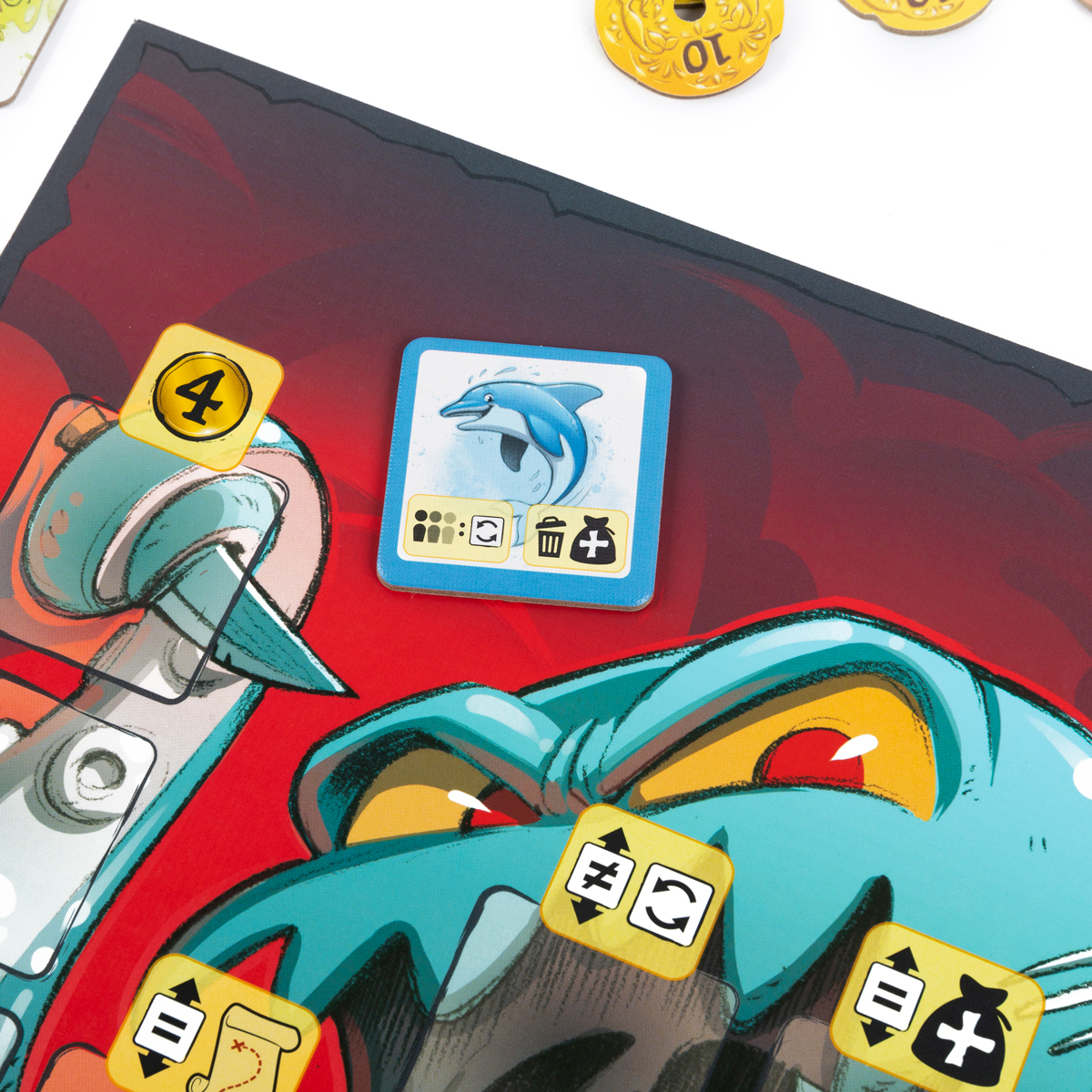 Вас ждёт несколько планшетов приключений со своими условиями, эффектами и конфигурацией ячеек для жетонов, чтобы сделать партии разнообразнее. Обратите внимание, что в российском издании в коробке вы найдёте промо-планшеты «В пасте Кракена» и промо-тайл с дельфином, а также правила для соло-игры.