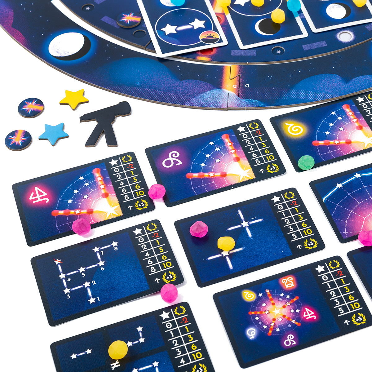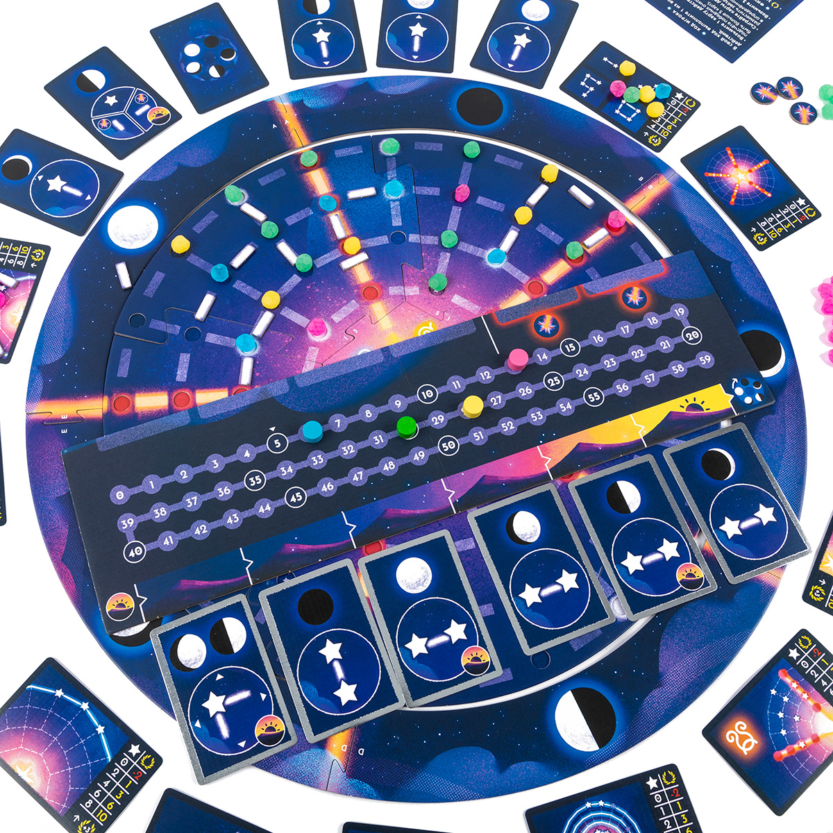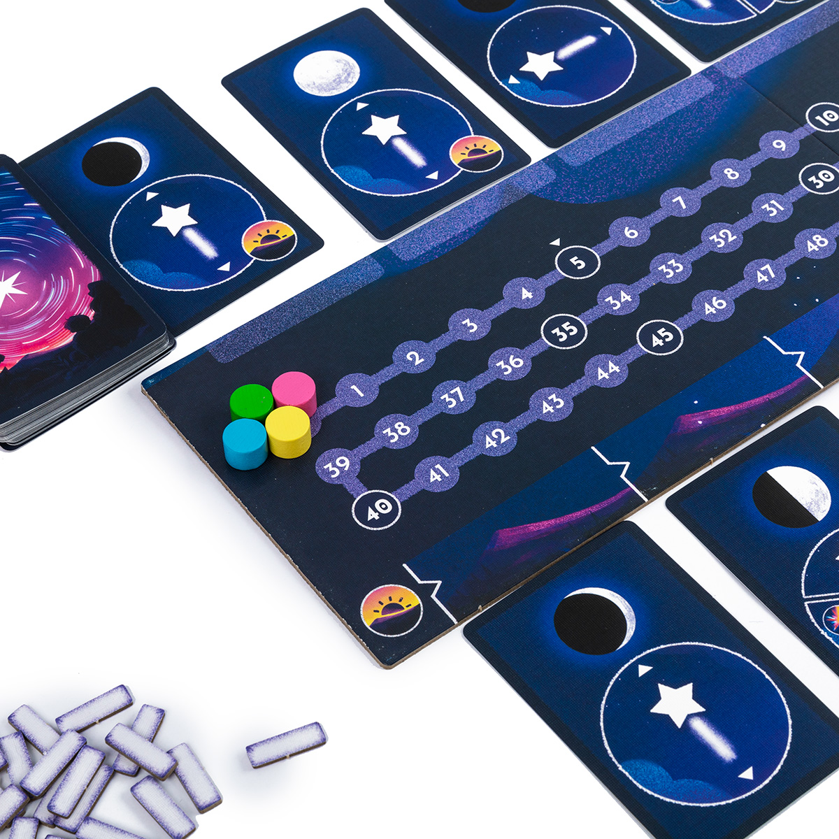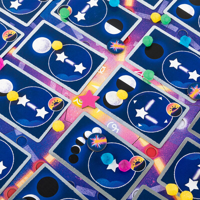 Каждый игрок выбирает цвет и получает 35 звёзд этого цвета. Раздайте личные цели, которые игроки не показывают друг другу, а рядом с каждой фазой луны положите карту общей цели.