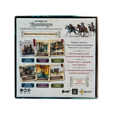 «Картавентура. Три мушкетёра» — настольная повествовательная игра из серии «Картавентура» . В этом приключении вы возьмёте на себя роли знаменитых на весь мир неразлучных друзей-мушкетёров.