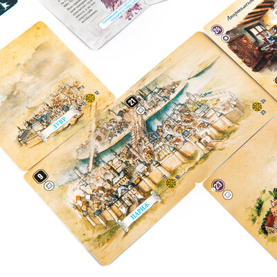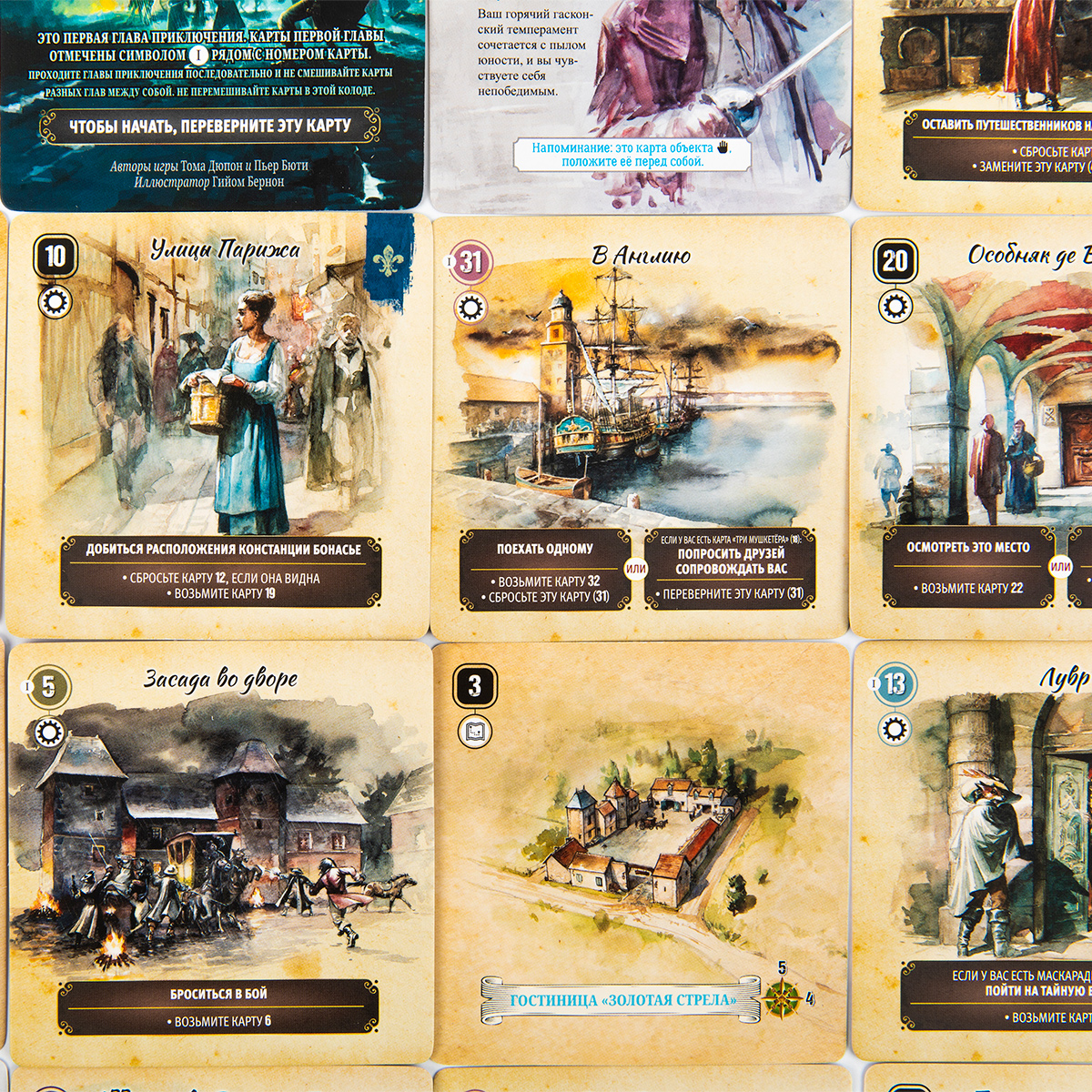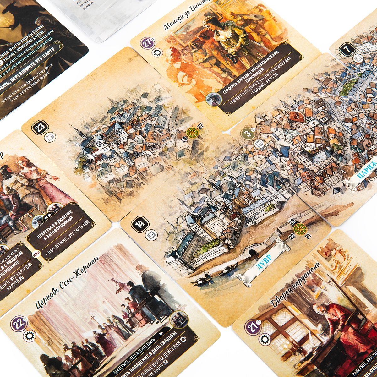 Чтобы начать, переверните первую карту и следуйте инструкциям. Постепенно сформируется карта местности, на которой вас будут ждать персонажи, предметы, опасности и большое количество сюжетных развилок.